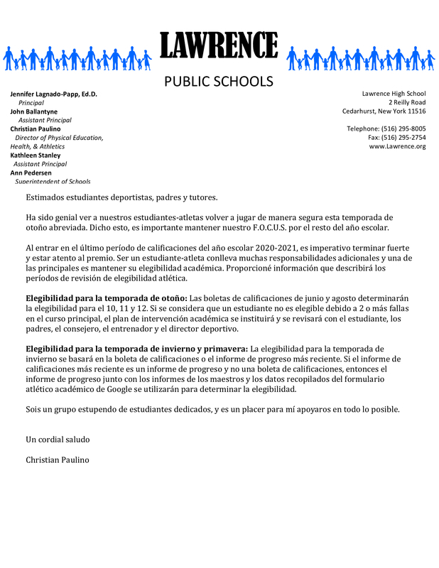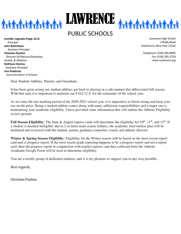 Please see the letters below (and links to the documents) from Mr. Paulino as we maintain FOCUS while still looking forward to athletics to return full time in 2021-22.