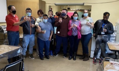 Photo 4: Mr. Mark Palladino, Life Skills Culinary instructor, Freddy Menendez, Ms. Jenni Guberman, classroom aide, Jonathan Vazquez, Joshua (C.J.) Srulovich, Marvin Guerra, Nadine Grossman, Ms. Theresa Philippou, classroom aide, D'Nico English