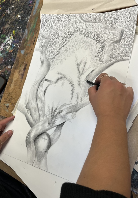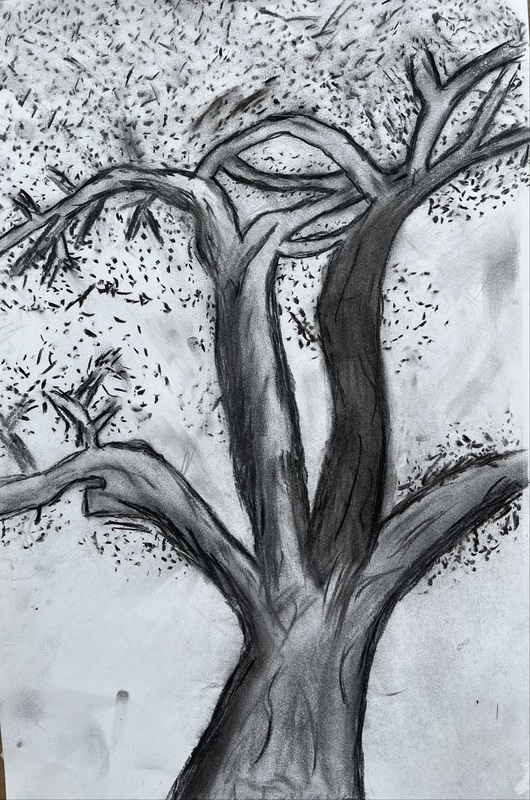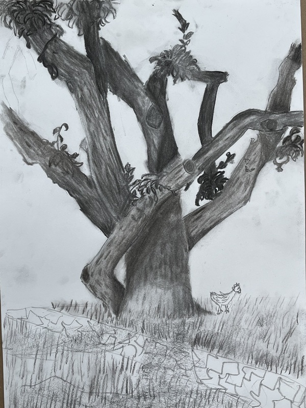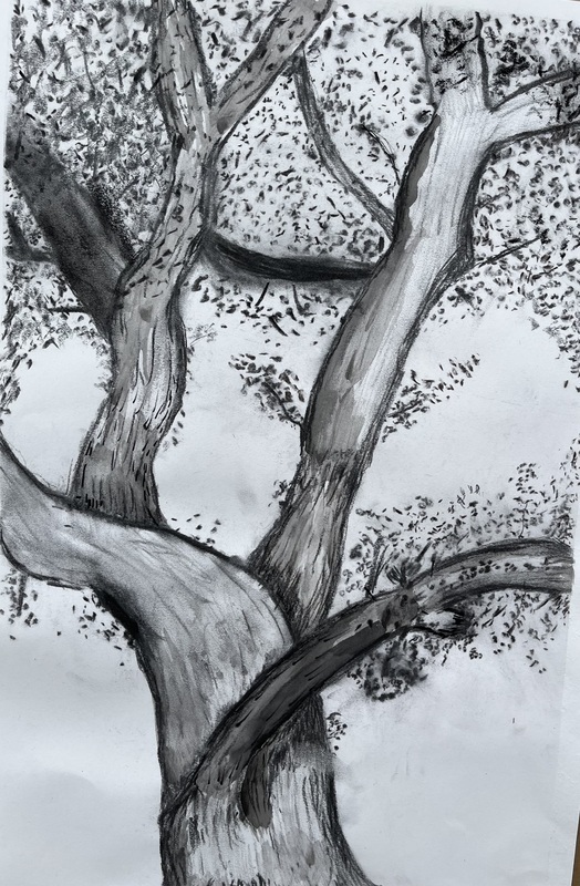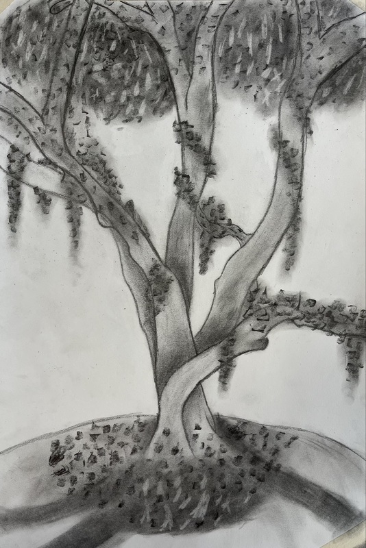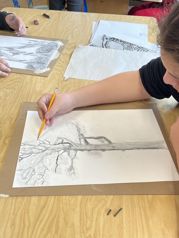 Drawing and Painting students have been exploring drawing from nature in multiple ways. Mrs. Ganes’s classes began the year drawing the Red Canna flowers in the high school courtyard and are currently starting to paint them in watercolor. A sketching trip to Rock Hall where there are trees that are over 200 years offered challenges to capture the trees with lines and textures. The chickens wandering around the sketching area added to the experience. After sketching most of the drawing on location, students finished the charcoal and ink drawings in class.